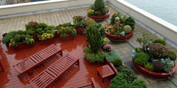Las terrazas y zonas abiertas interiores pueden ser una prolongación del paisaje y dar una intimidad de hogar. Pérgolas, tarimas, jardineras y mobiliario exterior, pueden conseguir que dichos espacios sean una prolongación de nuestra sala de estar, completamente rodeado de flores, olores y el frescor del color verde.